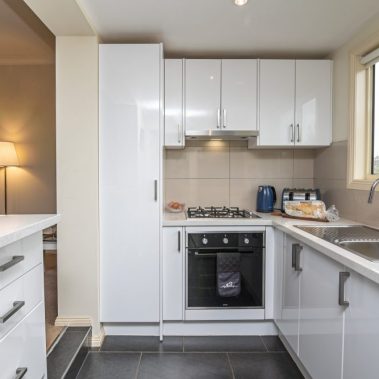 • Kitchen with cooktop, microwave, dishwasher & fridge